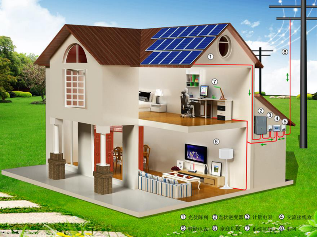 高性能的太陽能電池組件通過支架被集中安裝在屋頂上,經(jīng)過串聯(lián)并聯(lián)之后組成太陽能電池方陣,太陽能電池方陣吸收太陽光,并產(chǎn)生直流電, 經(jīng)過光伏逆變器后轉(zhuǎn)化為可供家用電器使用的交流電,剩余電可以上傳至電網(wǎng)中,獲得相應(yīng)的電價收入。